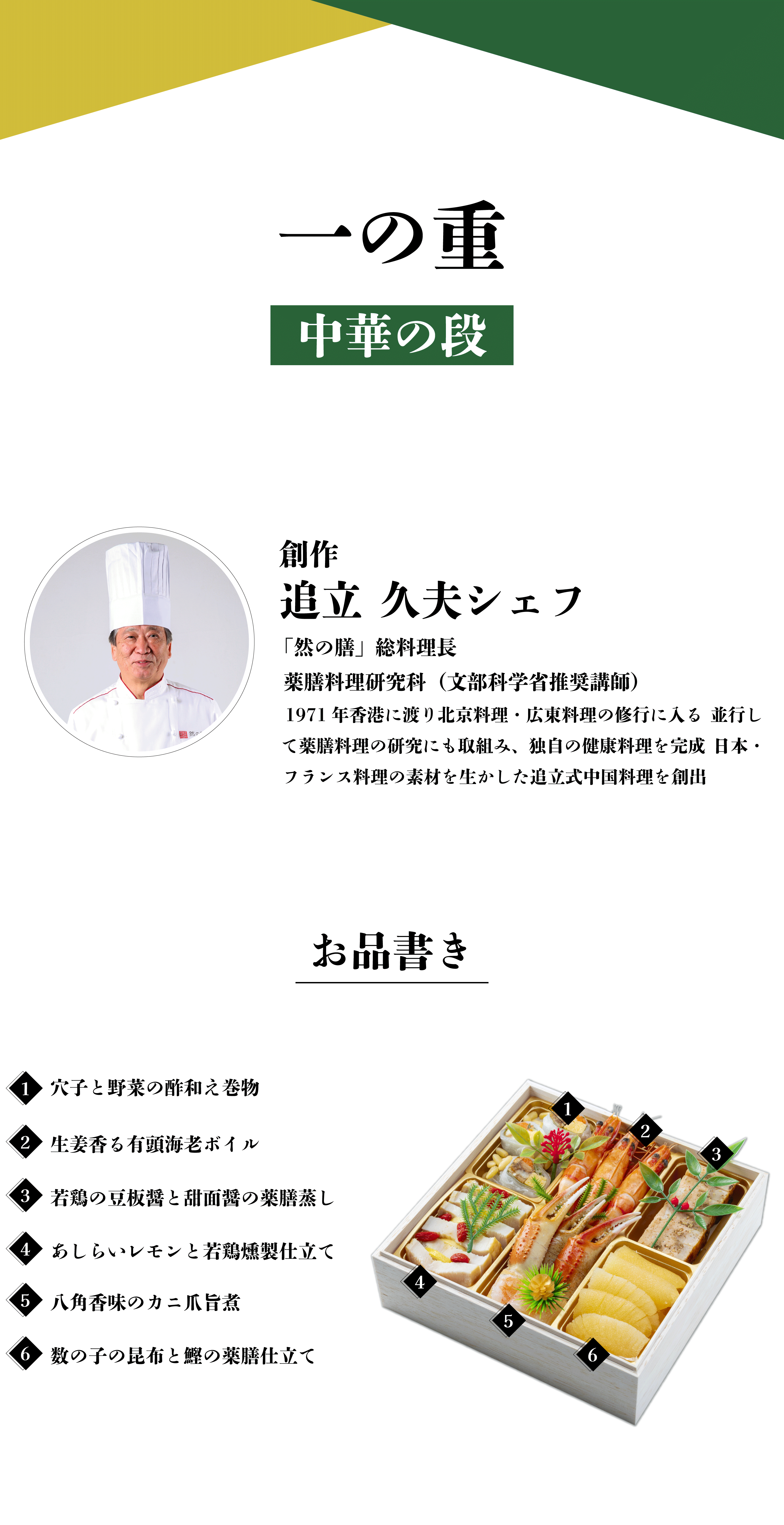 然の膳総料理長 追立久夫氏による、クコの実や八角などの生薬と食材を組み合わせた6品が詰まった一段。■ 二の重 ― 和食