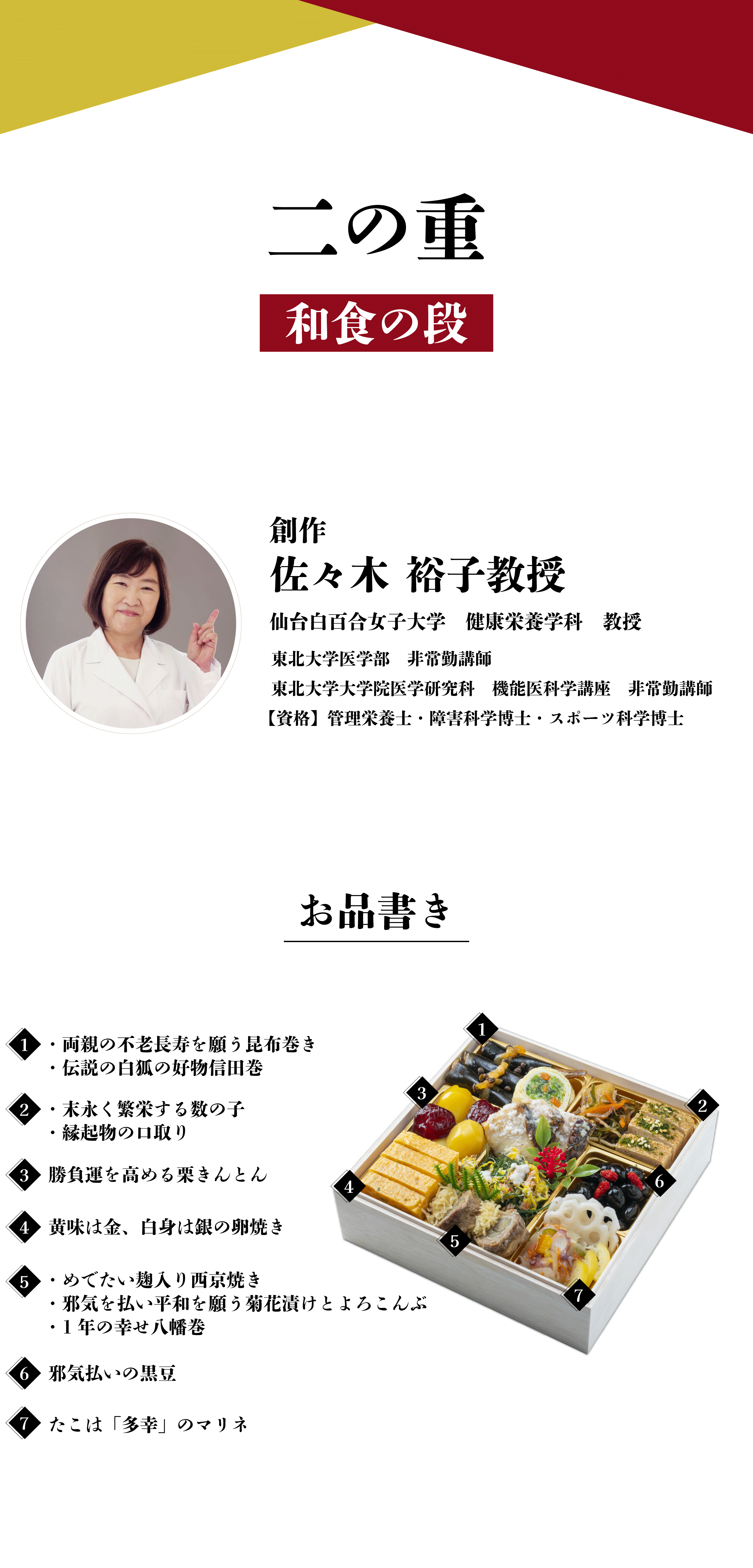 仙台白百合女子大学 健康栄養学科 佐々木裕子教授による、ひとつひとつに意味を込めた11品が詰まった和風の贅沢な一段。■ 三の重 ― 洋食