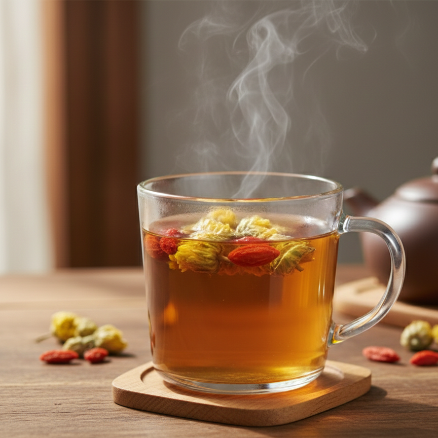 いつもの緑茶やほうじ茶に、乾燥した「菊花」と「クコの実」を数粒浮かべるだけで完成。