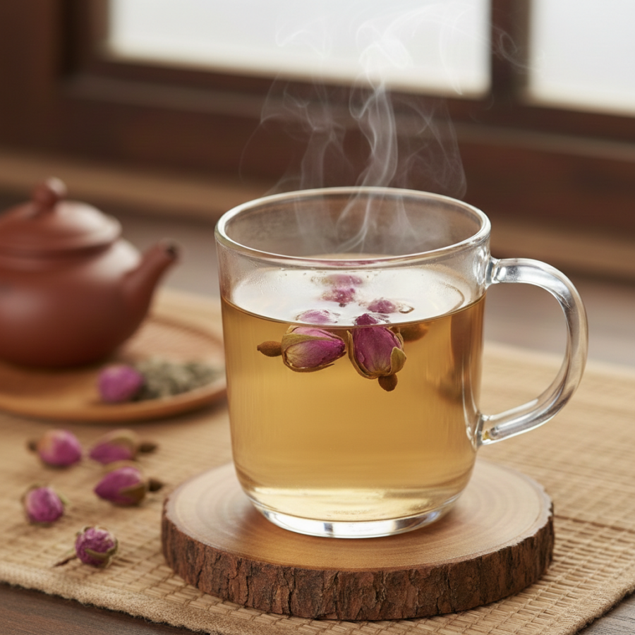 ジャスミン茶をベースに、バラのお花の蕾である「マイカイ花」を数個添えてみてください。お湯を注いだ瞬間に広がる香りが、まさに至福のひとときを演出してくれます。