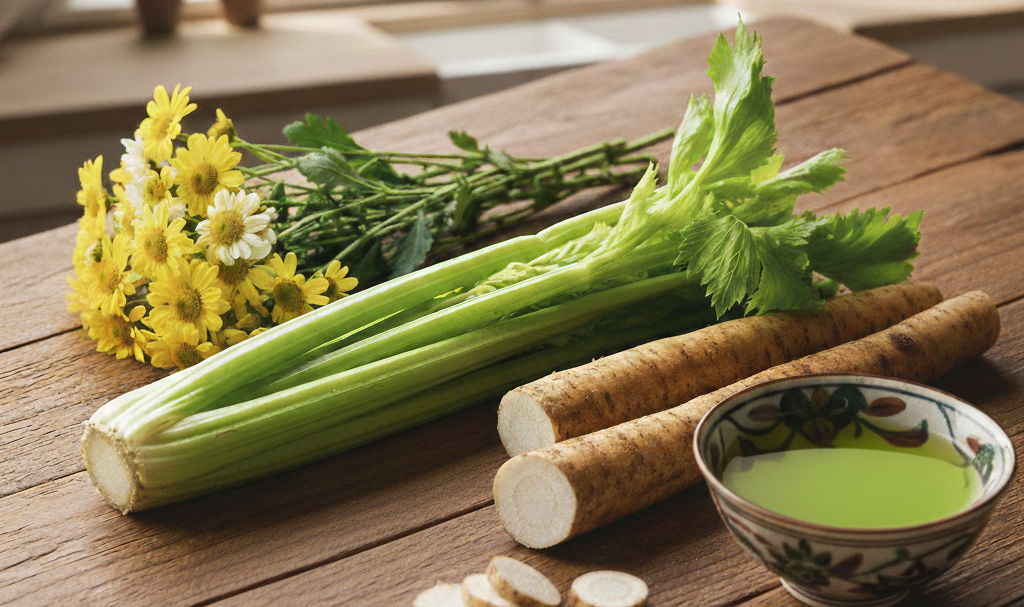 セロリ、菊花、ごぼう、緑茶
